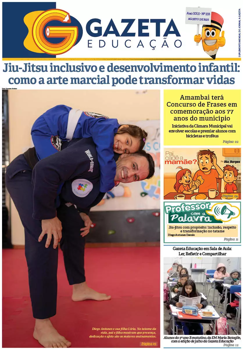 Na matéria de capa, “Jiu-Jitsu inclusivo e desenvolvimento infantil: como a arte marcial pode transformar vidas”, mostramos como o professor Diego Antunes prova, em suas aulas, que no tatame cada criança descobre ser capaz de vencer não apenas lutas, mas também seus próprios medos.