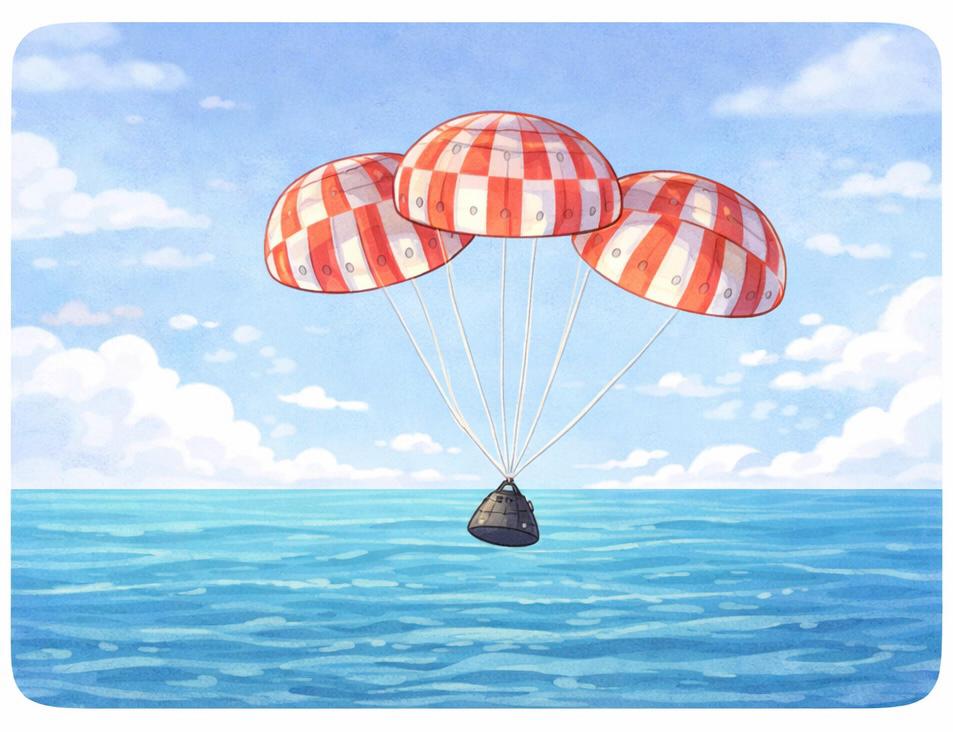 Primeiro, são acionados pequenos paraquedas, responsáveis por estabilizar a cápsula, como se estivessem “segurando” a nave para que tudo aconteça no controle certo.